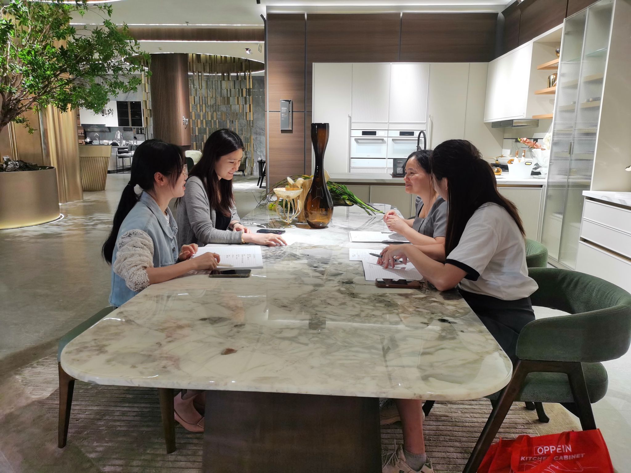 欧派家居人力资源部高怡璇简要介绍了企业发展历程和企业文化,重点介绍了企业接收实习生和历年来重点校企合作的情况,并带领参观了欧派总部北区的产品展厅。匡爱花简要介绍了公司在学科专业建设、团队队伍、人才培养等方面的基本情况,重点对人力资源管理专业、市场营销专业以及网络营销与直播电商专业的人才培养进行了调研。欧派社群主管孙娟和主播经理赵聪结合企业岗位实际用人情况针对专业课程设置、知识技能、职业素质以及职业证书提供了企业建议。