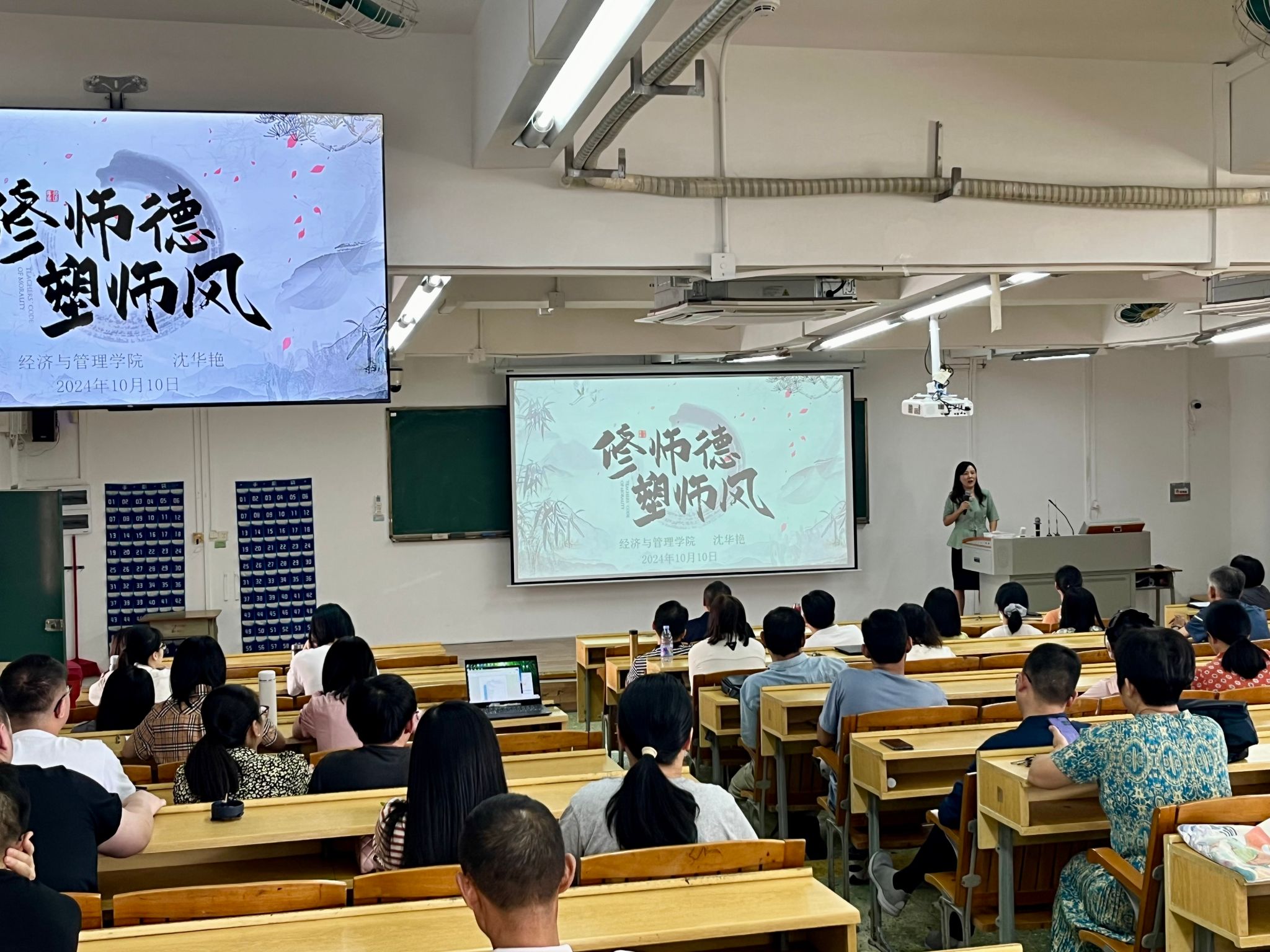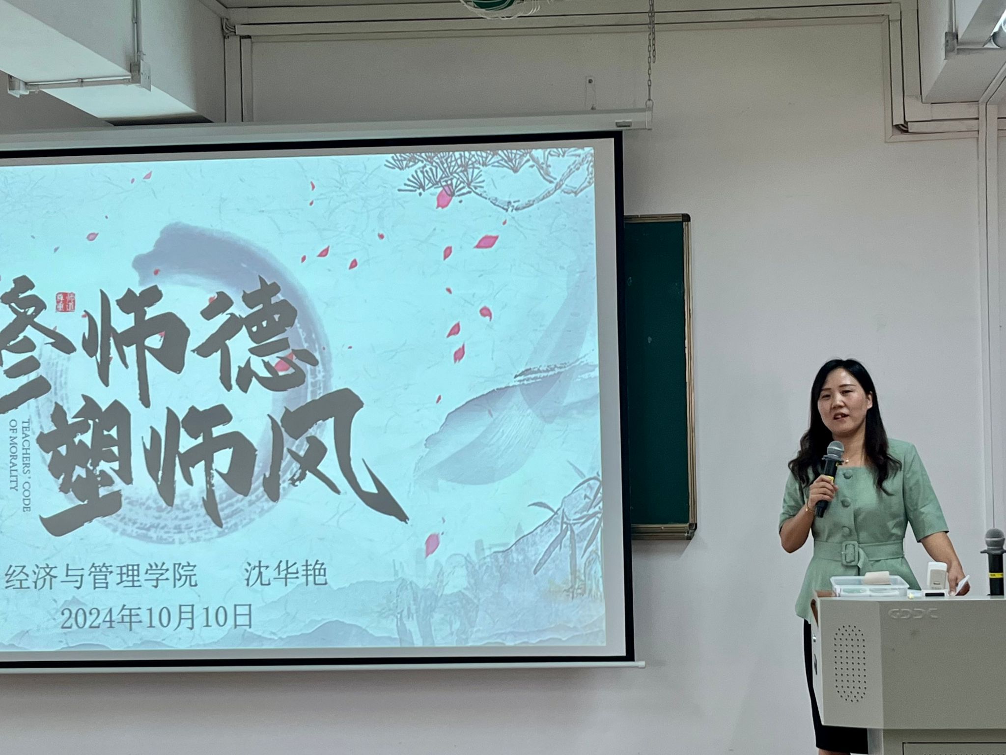 会上,沈华艳以《修师德塑师风》为主题开展师德师风教育,她指出,教师对员工的爱应当是一种职业情感,是道德情感之本,而不是个人情感或私情之爱;她认为,师爱不仅是泛爱,更是严爱,在行动上,则应严格要求,细心关怀,这种严而有理、严而有度、严而有恒的爱,才能真正促进员工的成长和发展。沈华艳以分析了未来教育的发展趋势,勉励全院教职员工要居安思危,同舟共济,再创佳绩,鼓励大家深钻细研、创新活力、挖掘潜力、真干实干、勇于担当、敢于负责,共同创造经管学院美好未来。
