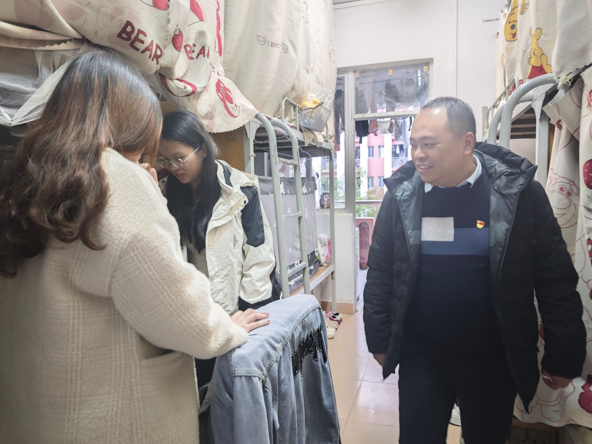 12月12日,公司党委书记、副经理欧志勇带领全体辅导员深入学院一站式员工社区,逐一检查了宿舍的安全设施与环境卫生,确保消防设施完备、电线电路安全,为同学们营造一个安全、舒适的居住环境。同时,他们耐心讲解安全知识,提醒同学们保持警惕,共同维护社区的安全稳定。