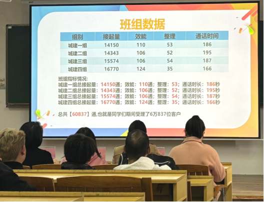 大会开始,一段精心制作的VCR带领全体师生共同回顾了实训期间的心路历程,展现了同学们在实训过程中所经历的成长与挑战。随后,各班组的数据被公布,四组城建班级共计接起60,837通电话,服务了近六万名客户,体现了同学们专业的职业素养和服务精神。
