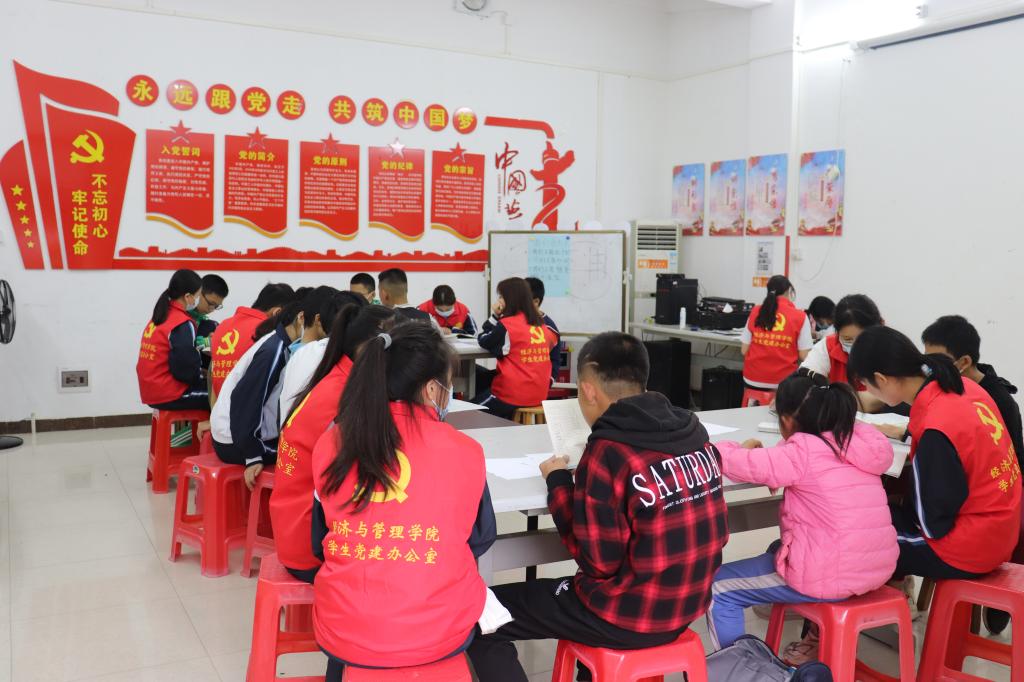 过程中,志愿者耐心细致地给小朋友指出学习上的问题,并在过程中穿插一些党史知识给少年们,目的就是从小培养他们爱党爱国的情怀,在浓浓的书卷香中,传递着他们的志愿服务精神。