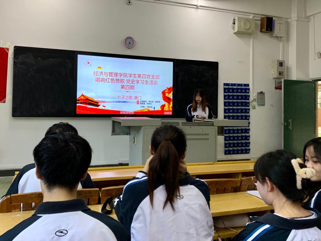 红色赞歌是我们身边的红色资源,传唱红色赞歌是传承红色基因的有效方式。会上,党支部成员何嘉名分享了《中国人民志愿军战歌》,“雄赳赳、气昂昂,跨过鸭绿江!保和平、卫祖国,就是保家乡……”这首曾激励中国人民志愿军将士英勇杀敌,唱响半个多世纪的战歌,在纪念抗美援朝出国作战70周年的日子里,又一次带我们回到硝烟弥漫的峥嵘岁月。他在会上引用当时历史的视频,让全体成员更加了解此红歌背后的党史故事。随后党支部成员陈弘桢分享了《七子之歌》,悠悠百年,沧桑巨变。放眼神州,彻底摆脱百年屈辱的“中华七子“,如同一串美丽的珍珠环绕在祖国的东海岸。