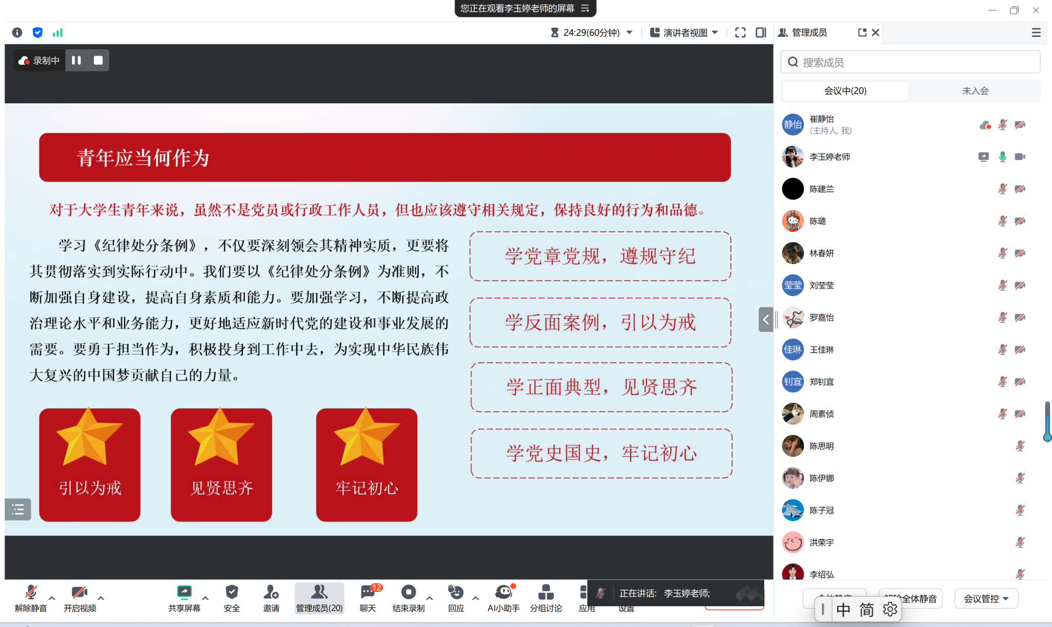 李玉婷老师首先强调了党纪教育的重要性和紧迫性,指出《中国共产党纪律处分条例》是规范党组织和党员行为的基础性法规,是维护党的团结统一、保持党的先进性和纯洁性的重要保障。在学习过程中,她紧紧围绕政治纪律、组织纪律、廉洁纪律、群众纪律、工作纪律和生活纪律六大方面,逐一展开阐述。她结合具体案例,生动形象地解析了违反纪律的严重后果,使同学们深刻认识到纪律的严肃性和不可触犯性。同时,李玉婷老师还鼓励同学们要树立正确的权力观和事业观,时刻保持清醒头脑和警惕意识,做到知敬畏、存戒惧、守底线。