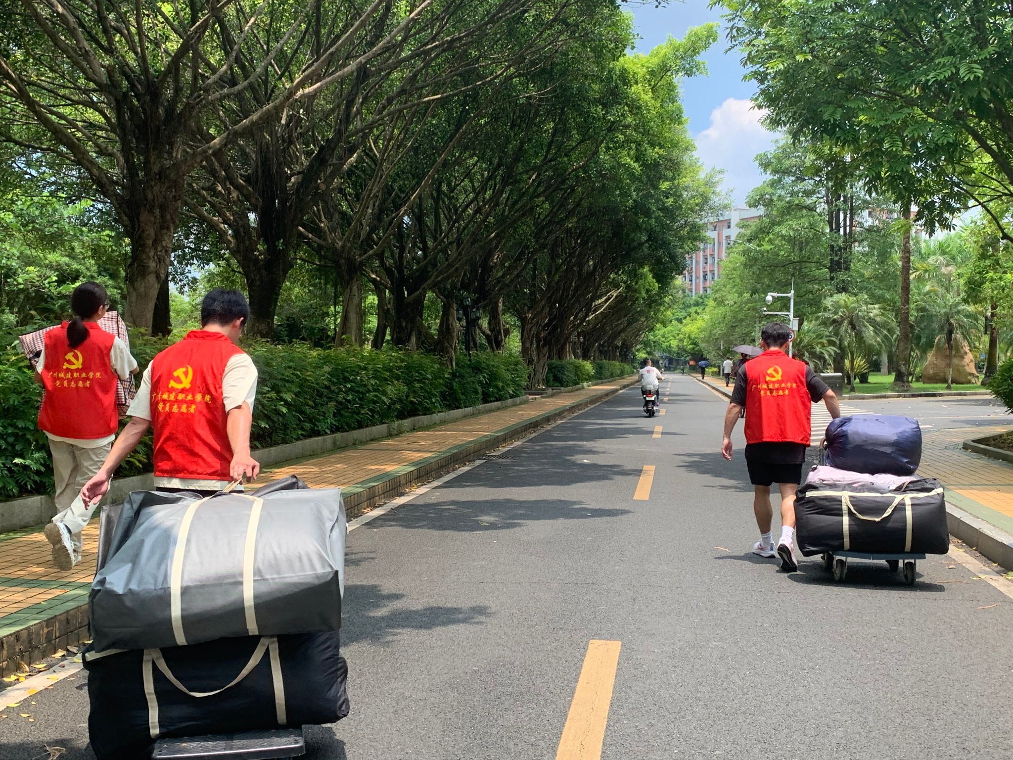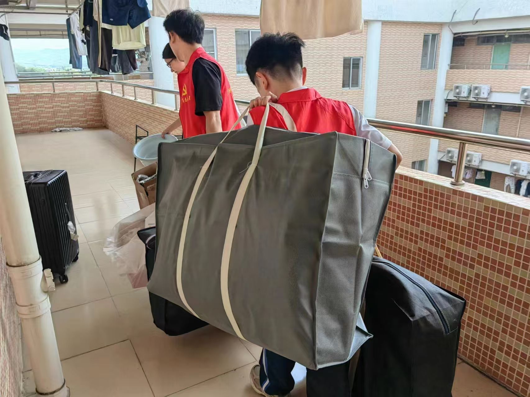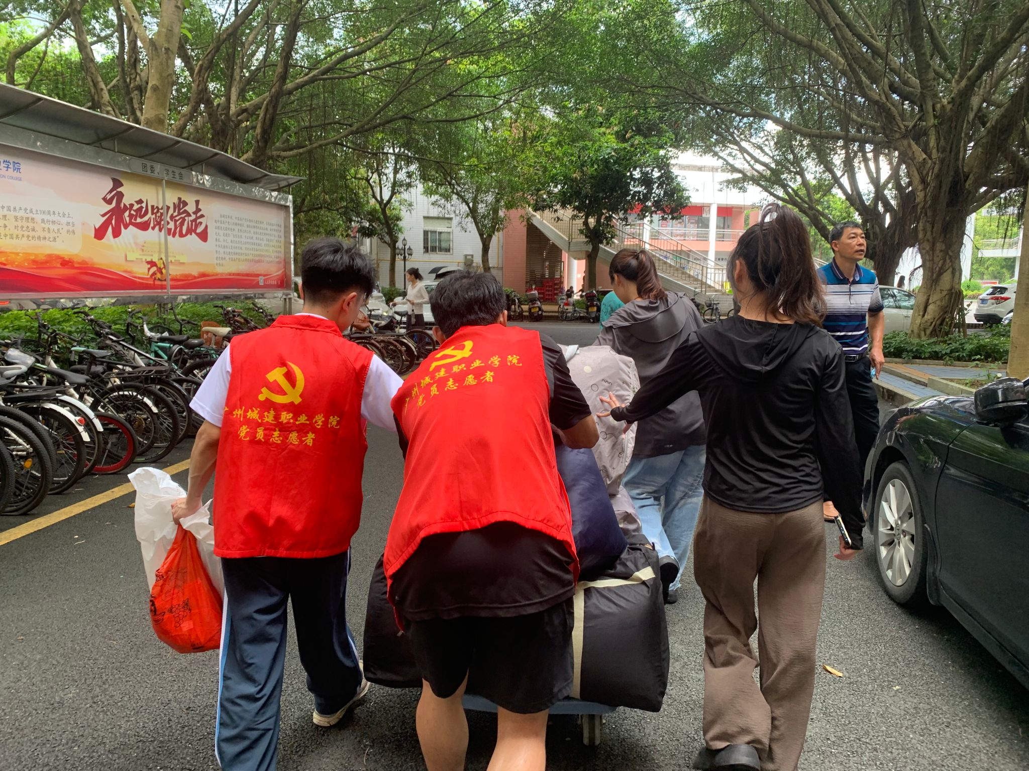 员工党员身着统一的志愿者服装,胸前佩戴着闪耀的党徽,他们精神饱满,热情洋溢,为即将踏上实习征程的同学们提供搬运行李的服务。他们分工明确,有的负责搬运大件行李,有的则负责整理和归类小件物品。在搬运过程中,党员志愿者们不仅展现了出色的团队协作能力和体力,更用他们的耐心和细心赢得了同学们的一致好评。