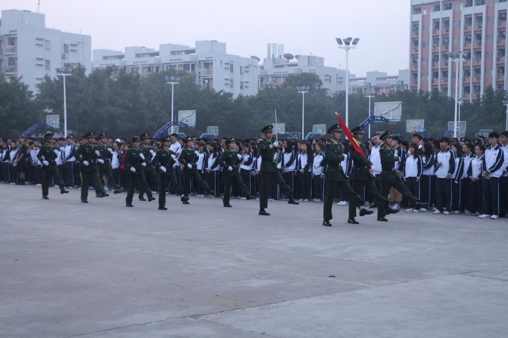 早上7:00,在全体师生的注目礼下,国旗护卫队的队员们整齐有序地护送着五星红旗,迈着铿锵有力地步伐走向升旗台,五星红旗伴随着庄严的国歌在升旗台上冉冉升起。鲜艳的国旗迎风飘扬,精神抖擞的师生在五星红旗下,焕发出不一样的风彩。