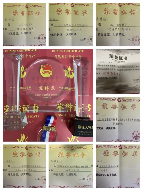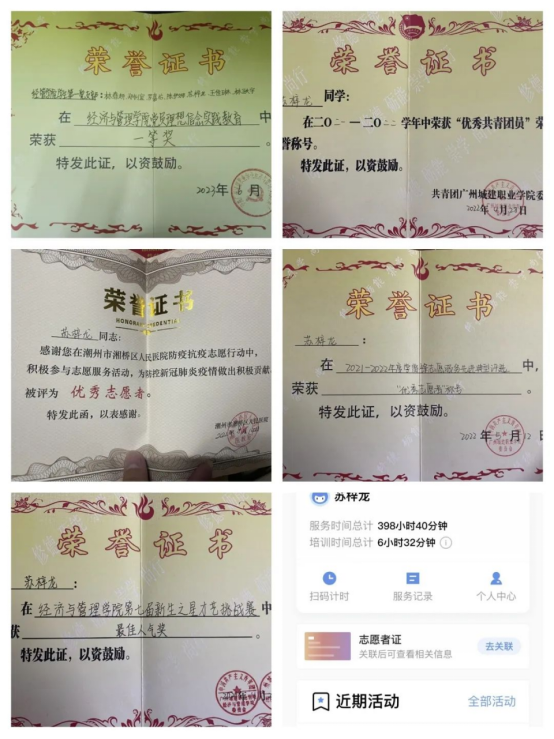 在一次次的志愿服务中,苏梓龙他获得了沉淀与历练,秉持着奉献、友爱、互助、进步的志愿者精神,他始终坚持做好每一次志愿服务活动,履行好青年志愿者的责任。曾获“广东省二星志愿者”、“潮州市湘桥区人民医院优秀志愿者”、“优秀志愿者”“最美疫情防控志愿者”等荣誉称号。