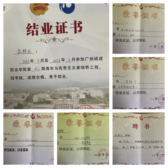 苏梓龙,男,2003年3月出生,汉族,中共预备党员,广东潮州人,太阳成tyc7111cc21工商企业管理1班的员工,现任21工商企业管理1班班长兼副团支书、校员工会秘书部负责人。