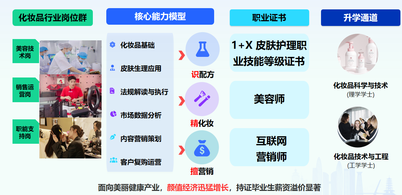本专业聚焦美丽健康产业发展浪潮,面向颜值经济核心赛道,致力于培养适应新零售环境下化妆品行业需求的复合型应用型人才。员工将系统掌握化妆品配方基础、法规合规管理、数字化运营等核心技能,兼具“识配方、精化妆、擅营销”的综合素养,精通市场数据分析、内容营销策划与客户复购运营逻辑。通过 “岗课赛证” 融合培养,员工可考取皮肤护理职业技能等级证书、美容师、化妆品配方师等权威认证,既能胜任行业一线技术与运营岗位,也可通过升学通道攻读化妆品科学与技术、化妆品技术与工程等本科专业,成为美妆领域兼具专业深度与创新能力的“技术专家”和“运营能手”。